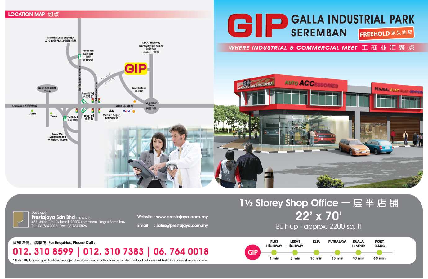 GIP (Galla Industrial Park) & TMG (Taman Mutiara Galla) are both joint venture project developing by Prestajaya Sdn. Bhd. (‘the Developer’) with Majlis Perbandaran Seremban (‘MPS’), which is the landowner.